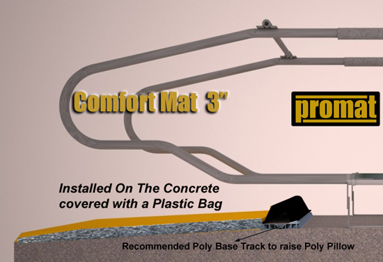 COMFORT MAT is a 3 inch thick foam with a built in slope for drainage. This is a high density foam that is installed on a concrete base covered by a plastic bag.