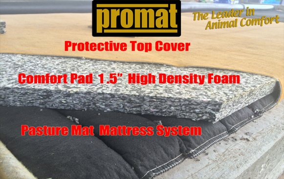 Unlike competitive mats, Pasture Mat also takes into account one vital and relatively unknown aspect of cow physiology. In the process of lying down the animal actually free falls the last 10 to 12 inches. As you can image, the impact of 1,400+ pounds of bodyweight hitting a concrete floor is considerable. The fact is, sooner or later she's going to end up with festering sores for that constant abrasion.Pasture Mat is shock absorbent, thereby eliminating the risk of injury.